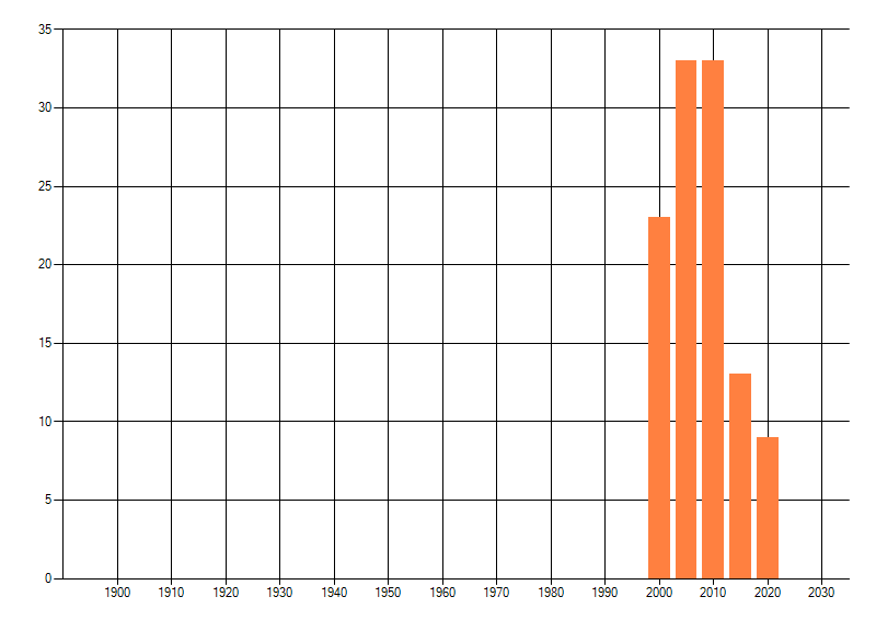 Het aantal atlasblokken (5x5 km) waarin de soort is gemeld binnen een periode van vijf jaar (vanaf 1980) of twintig jaar. Niet gecorrigeerd voor waarnemersinspanning en het aantal doorgegeven waarnemingen kan sterk variëren per periode, dus een trend in verspreiding kan hier niet direct uit worden afgelezen. Het opgegeven jaartal is het eerste jaar van de periode. Bron: gevalideerde waarnemingen uit de NDFF.