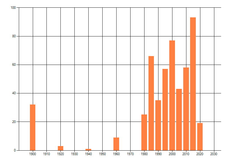 Het aantal atlasblokken (5x5 km) waarin de soort is gemeld binnen een periode van vijf jaar (vanaf 1980) of twintig jaar. Niet gecorrigeerd voor waarnemersinspanning en het aantal doorgegeven waarnemingen kan sterk variëren per periode, dus een trend in verspreiding kan hier niet direct uit worden afgelezen. Het opgegeven jaartal is het eerste jaar van de periode. Bron: gevalideerde waarnemingen uit de NDFF.