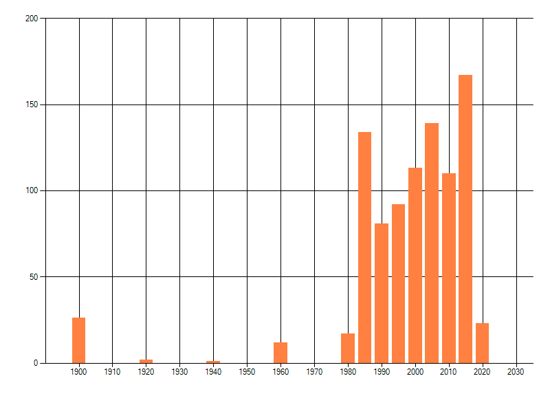 Het aantal atlasblokken (5x5 km) waarin de soort is gemeld binnen een periode van vijf jaar (vanaf 1980) of twintig jaar. Niet gecorrigeerd voor waarnemersinspanning en het aantal doorgegeven waarnemingen kan sterk variëren per periode, dus een trend in verspreiding kan hier niet direct uit worden afgelezen. Het opgegeven jaartal is het eerste jaar van de periode. Bron: gevalideerde waarnemingen uit de NDFF.
