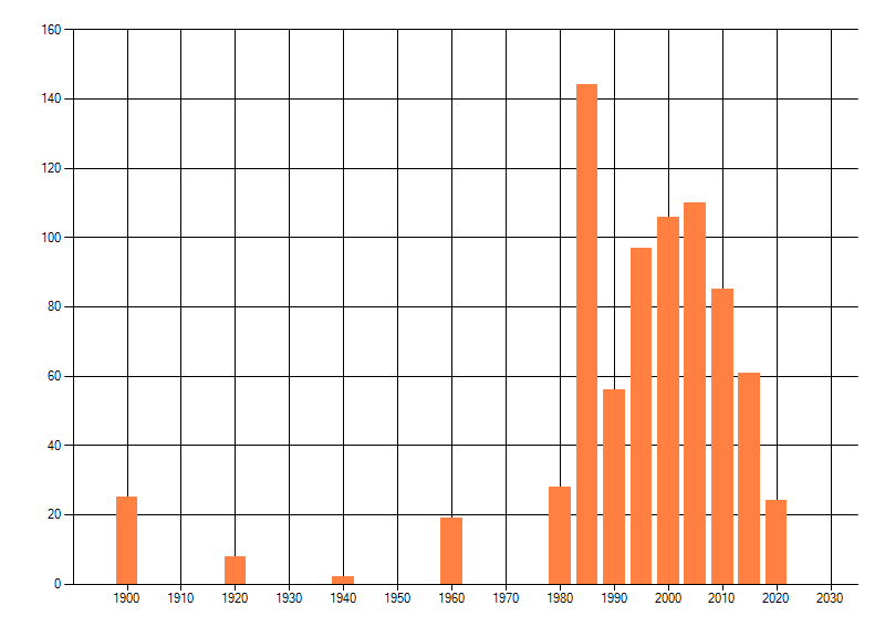 Het aantal atlasblokken (5x5 km) waarin de soort is gemeld binnen een periode van vijf jaar (vanaf 1980) of twintig jaar. Niet gecorrigeerd voor waarnemersinspanning en het aantal doorgegeven waarnemingen kan sterk variëren per periode, dus een trend in verspreiding kan hier niet direct uit worden afgelezen. Het opgegeven jaartal is het eerste jaar van de periode. Bron: gevalideerde waarnemingen uit de NDFF.