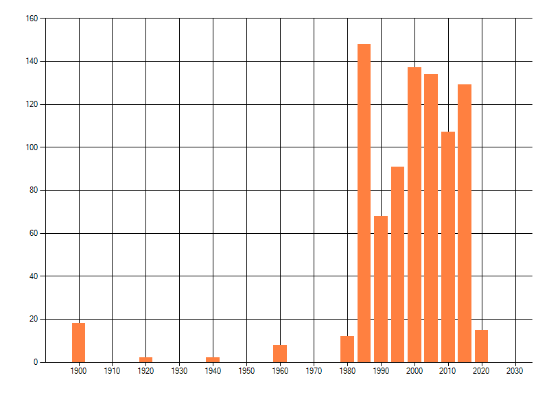 Het aantal atlasblokken (5x5 km) waarin de soort is gemeld binnen een periode van vijf jaar (vanaf 1980) of twintig jaar. Niet gecorrigeerd voor waarnemersinspanning en het aantal doorgegeven waarnemingen kan sterk variëren per periode, dus een trend in verspreiding kan hier niet direct uit worden afgelezen. Het opgegeven jaartal is het eerste jaar van de periode. Bron: gevalideerde waarnemingen uit de NDFF.