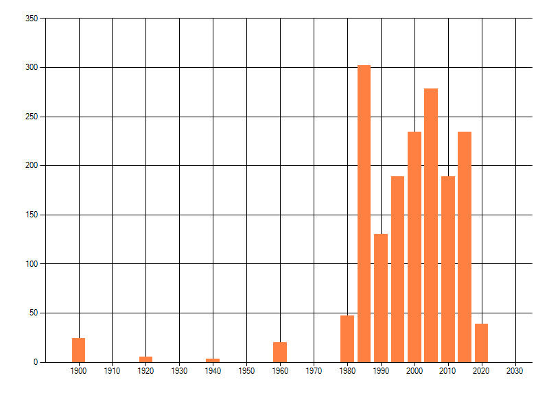 Het aantal atlasblokken (5x5 km) waarin de soort is gemeld binnen een periode van vijf jaar (vanaf 1980) of twintig jaar. Niet gecorrigeerd voor waarnemersinspanning en het aantal doorgegeven waarnemingen kan sterk variëren per periode, dus een trend in verspreiding kan hier niet direct uit worden afgelezen. Het opgegeven jaartal is het eerste jaar van de periode. Bron: gevalideerde waarnemingen uit de NDFF.