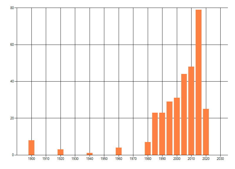 Het aantal atlasblokken (5x5 km) waarin de soort is gemeld binnen een periode van vijf jaar (vanaf 1980) of twintig jaar. Niet gecorrigeerd voor waarnemersinspanning en het aantal doorgegeven waarnemingen kan sterk variëren per periode, dus een trend in verspreiding kan hier niet direct uit worden afgelezen. Het opgegeven jaartal is het eerste jaar van de periode. Bron: gevalideerde waarnemingen uit de NDFF.