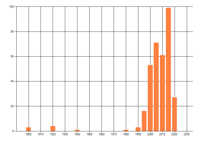 Het aantal atlasblokken (5x5 km) waarin de soort is gemeld binnen een periode van vijf jaar (vanaf 1980) of twintig jaar. Niet gecorrigeerd voor waarnemersinspanning en het aantal doorgegeven waarnemingen kan sterk variëren per periode, dus een trend in verspreiding kan hier niet direct uit worden afgelezen. Het opgegeven jaartal is het eerste jaar van de periode. Bron: gevalideerde waarnemingen uit de NDFF.