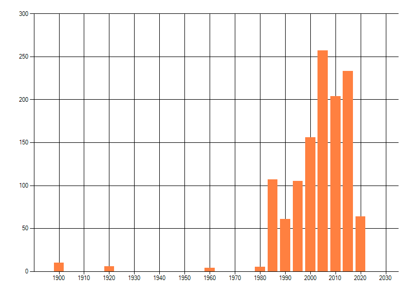 Het aantal atlasblokken (5x5 km) waarin de soort is gemeld binnen een periode van vijf jaar (vanaf 1980) of twintig jaar. Niet gecorrigeerd voor waarnemersinspanning en het aantal doorgegeven waarnemingen kan sterk variëren per periode, dus een trend in verspreiding kan hier niet direct uit worden afgelezen. Het opgegeven jaartal is het eerste jaar van de periode. Bron: gevalideerde waarnemingen uit de NDFF.
