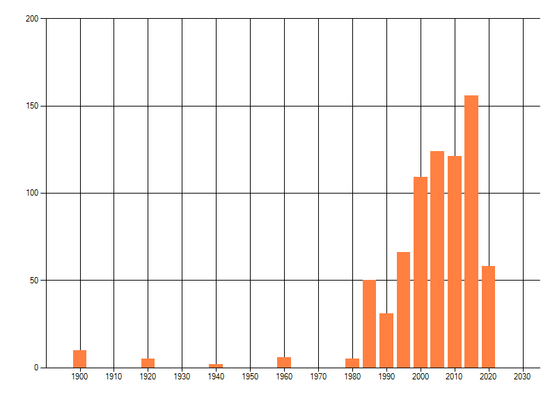 Het aantal atlasblokken (5x5 km) waarin de soort is gemeld binnen een periode van vijf jaar (vanaf 1980) of twintig jaar. Niet gecorrigeerd voor waarnemersinspanning en het aantal doorgegeven waarnemingen kan sterk variëren per periode, dus een trend in verspreiding kan hier niet direct uit worden afgelezen. Het opgegeven jaartal is het eerste jaar van de periode. Bron: gevalideerde waarnemingen uit de NDFF.