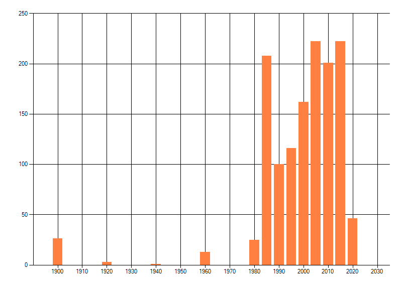 Het aantal atlasblokken (5x5 km) waarin de soort is gemeld binnen een periode van vijf jaar (vanaf 1980) of twintig jaar. Niet gecorrigeerd voor waarnemersinspanning en het aantal doorgegeven waarnemingen kan sterk variëren per periode, dus een trend in verspreiding kan hier niet direct uit worden afgelezen. Het opgegeven jaartal is het eerste jaar van de periode. Bron: gevalideerde waarnemingen uit de NDFF.
