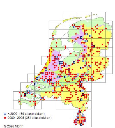 Het aantal atlasblokken (5x5 km) waarin de soort is gemeld binnen een periode van vijf jaar (vanaf 1980) of twintig jaar. Niet gecorrigeerd voor waarnemersinspanning en het aantal doorgegeven waarnemingen kan sterk variëren per periode, dus een trend in verspreiding kan hier niet direct uit worden afgelezen. Het opgegeven jaartal is het eerste jaar van de periode. Bron: gevalideerde waarnemingen uit de NDFF.