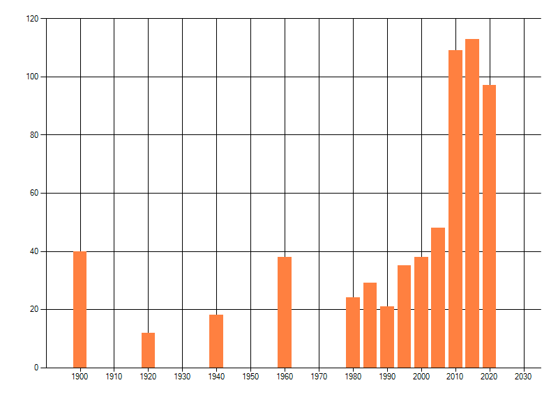 Het aantal atlasblokken (5x5 km) waarin de soort is gemeld binnen een periode van vijf jaar (vanaf 1980) of twintig jaar. Niet gecorrigeerd voor waarnemersinspanning en het aantal doorgegeven waarnemingen kan sterk variëren per periode, dus een trend in verspreiding kan hier niet direct uit worden afgelezen. Het opgegeven jaartal is het eerste jaar van de periode. Bron: gevalideerde waarnemingen uit de NDFF.