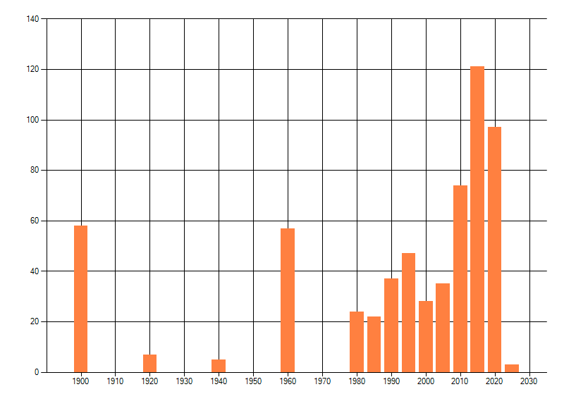 Het aantal atlasblokken (5x5 km) waarin de soort is gemeld binnen een periode van vijf jaar (vanaf 1980) of twintig jaar. Niet gecorrigeerd voor waarnemersinspanning en het aantal doorgegeven waarnemingen kan sterk variëren per periode, dus een trend in verspreiding kan hier niet direct uit worden afgelezen. Het opgegeven jaartal is het eerste jaar van de periode. Bron: gevalideerde waarnemingen uit de NDFF.