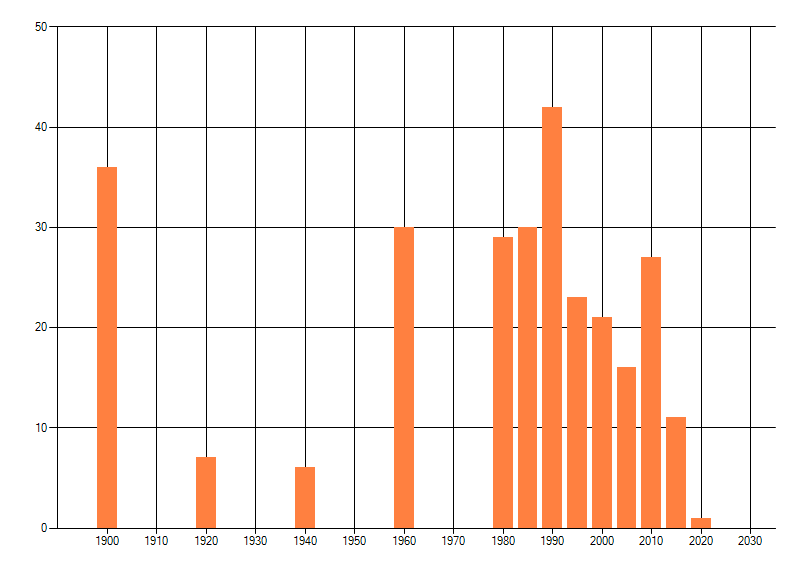 Het aantal atlasblokken (5x5 km) waarin de soort is gemeld binnen een periode van vijf jaar (vanaf 1980) of twintig jaar. Niet gecorrigeerd voor waarnemersinspanning en het aantal doorgegeven waarnemingen kan sterk variëren per periode, dus een trend in verspreiding kan hier niet direct uit worden afgelezen. Het opgegeven jaartal is het eerste jaar van de periode. Bron: gevalideerde waarnemingen uit de NDFF.