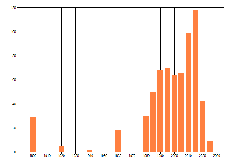 Het aantal atlasblokken (5x5 km) waarin de soort is gemeld binnen een periode van vijf jaar (vanaf 1980) of twintig jaar. Niet gecorrigeerd voor waarnemersinspanning en het aantal doorgegeven waarnemingen kan sterk variëren per periode, dus een trend in verspreiding kan hier niet direct uit worden afgelezen. Het opgegeven jaartal is het eerste jaar van de periode. Bron: gevalideerde waarnemingen uit de NDFF.
