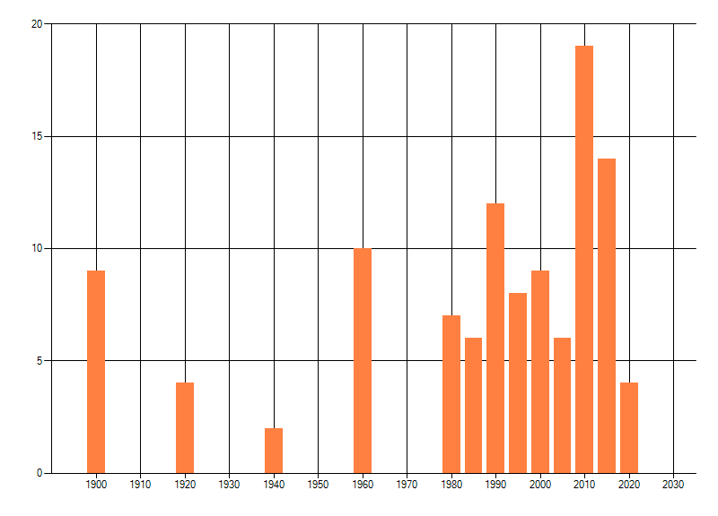 Het aantal atlasblokken (5x5 km) waarin de soort is gemeld binnen een periode van vijf jaar (vanaf 1980) of twintig jaar. Niet gecorrigeerd voor waarnemersinspanning en het aantal doorgegeven waarnemingen kan sterk variëren per periode, dus een trend in verspreiding kan hier niet direct uit worden afgelezen. Het opgegeven jaartal is het eerste jaar van de periode. Bron: gevalideerde waarnemingen uit de NDFF.