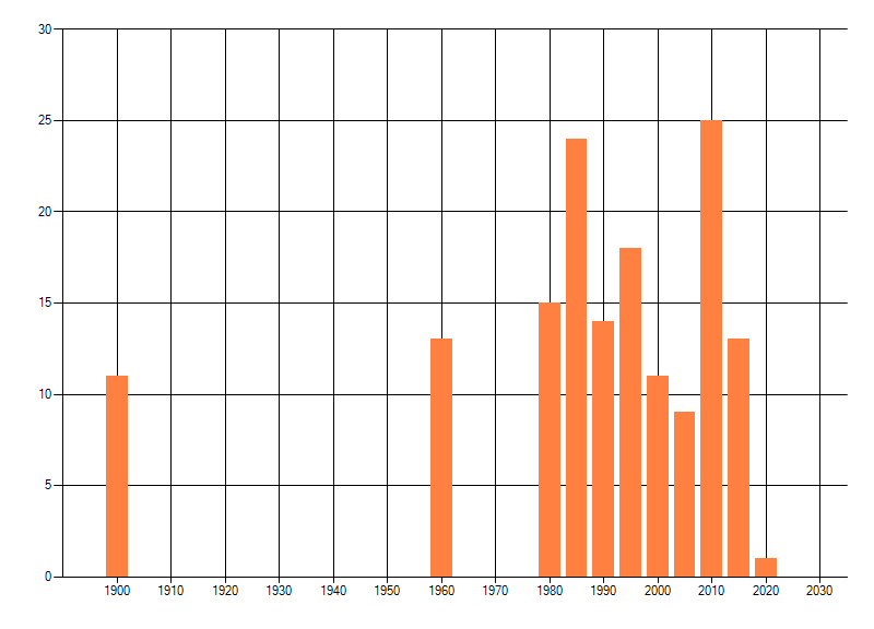Het aantal atlasblokken (5x5 km) waarin de soort is gemeld binnen een periode van vijf jaar (vanaf 1980) of twintig jaar. Niet gecorrigeerd voor waarnemersinspanning en het aantal doorgegeven waarnemingen kan sterk variëren per periode, dus een trend in verspreiding kan hier niet direct uit worden afgelezen. Het opgegeven jaartal is het eerste jaar van de periode. Bron: gevalideerde waarnemingen uit de NDFF.