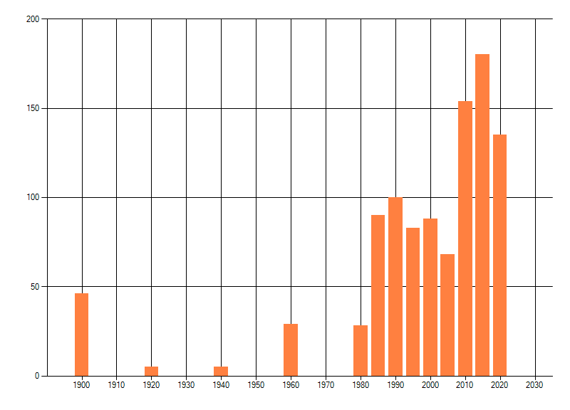 Het aantal atlasblokken (5x5 km) waarin de soort is gemeld binnen een periode van vijf jaar (vanaf 1980) of twintig jaar. Niet gecorrigeerd voor waarnemersinspanning en het aantal doorgegeven waarnemingen kan sterk variëren per periode, dus een trend in verspreiding kan hier niet direct uit worden afgelezen. Het opgegeven jaartal is het eerste jaar van de periode. Bron: gevalideerde waarnemingen uit de NDFF.