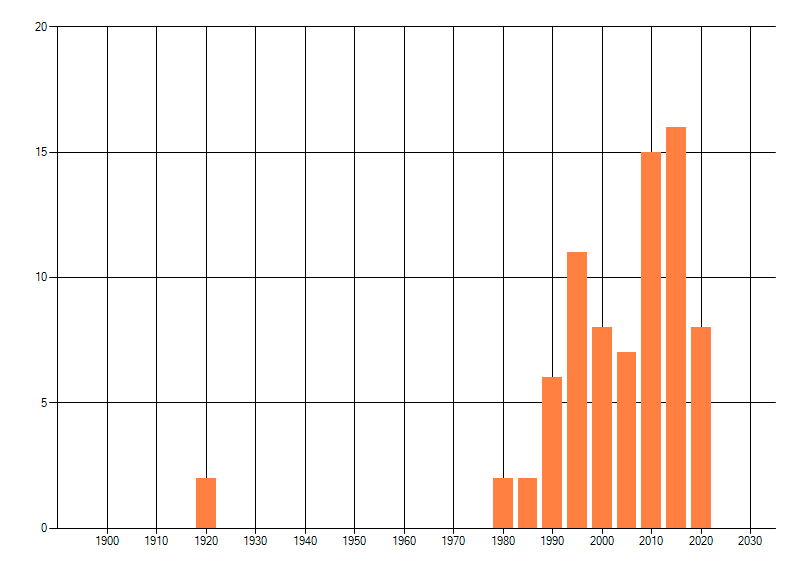 Het aantal atlasblokken (5x5 km) waarin de soort is gemeld binnen een periode van vijf jaar (vanaf 1980) of twintig jaar. Niet gecorrigeerd voor waarnemersinspanning en het aantal doorgegeven waarnemingen kan sterk variëren per periode, dus een trend in verspreiding kan hier niet direct uit worden afgelezen. Het opgegeven jaartal is het eerste jaar van de periode. Bron: gevalideerde waarnemingen uit de NDFF.