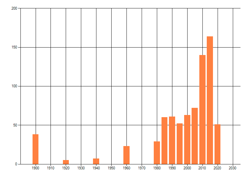 Het aantal atlasblokken (5x5 km) waarin de soort is gemeld binnen een periode van vijf jaar (vanaf 1980) of twintig jaar. Niet gecorrigeerd voor waarnemersinspanning en het aantal doorgegeven waarnemingen kan sterk variëren per periode, dus een trend in verspreiding kan hier niet direct uit worden afgelezen. Het opgegeven jaartal is het eerste jaar van de periode. Bron: gevalideerde waarnemingen uit de NDFF.