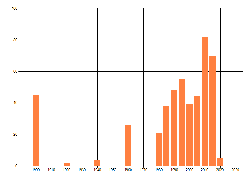 Het aantal atlasblokken (5x5 km) waarin de soort is gemeld binnen een periode van vijf jaar (vanaf 1980) of twintig jaar. Niet gecorrigeerd voor waarnemersinspanning en het aantal doorgegeven waarnemingen kan sterk variëren per periode, dus een trend in verspreiding kan hier niet direct uit worden afgelezen. Het opgegeven jaartal is het eerste jaar van de periode. Bron: gevalideerde waarnemingen uit de NDFF.