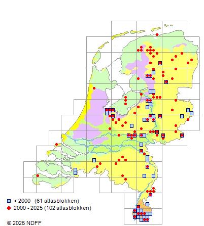 Het aantal atlasblokken (5x5 km) waarin de soort is gemeld binnen een periode van vijf jaar (vanaf 1980) of twintig jaar. Niet gecorrigeerd voor waarnemersinspanning en het aantal doorgegeven waarnemingen kan sterk variëren per periode, dus een trend in verspreiding kan hier niet direct uit worden afgelezen. Het opgegeven jaartal is het eerste jaar van de periode. Bron: gevalideerde waarnemingen uit de NDFF.