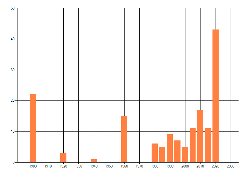 Het aantal atlasblokken (5x5 km) waarin de soort is gemeld binnen een periode van vijf jaar (vanaf 1980) of twintig jaar. Niet gecorrigeerd voor waarnemersinspanning en het aantal doorgegeven waarnemingen kan sterk variëren per periode, dus een trend in verspreiding kan hier niet direct uit worden afgelezen. Het opgegeven jaartal is het eerste jaar van de periode. Bron: gevalideerde waarnemingen uit de NDFF.