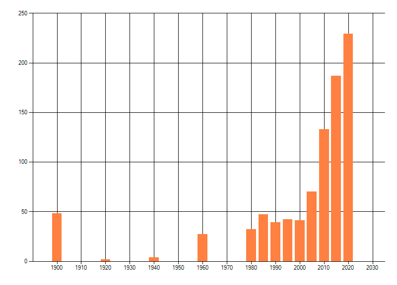 Het aantal atlasblokken (5x5 km) waarin de soort is gemeld binnen een periode van vijf jaar (vanaf 1980) of twintig jaar. Niet gecorrigeerd voor waarnemersinspanning en het aantal doorgegeven waarnemingen kan sterk variëren per periode, dus een trend in verspreiding kan hier niet direct uit worden afgelezen. Het opgegeven jaartal is het eerste jaar van de periode. Bron: gevalideerde waarnemingen uit de NDFF.