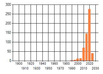Het aantal atlasblokken (5x5 km) waarin de soort is gemeld binnen een periode van vijf jaar (vanaf 1980) of twintig jaar. Niet gecorrigeerd voor waarnemersinspanning en het aantal doorgegeven waarnemingen kan sterk variëren per periode, dus een trend in verspreiding kan hier niet direct uit worden afgelezen. Het opgegeven jaartal is het eerste jaar van de periode. Bron: gevalideerde waarnemingen uit de NDFF.
