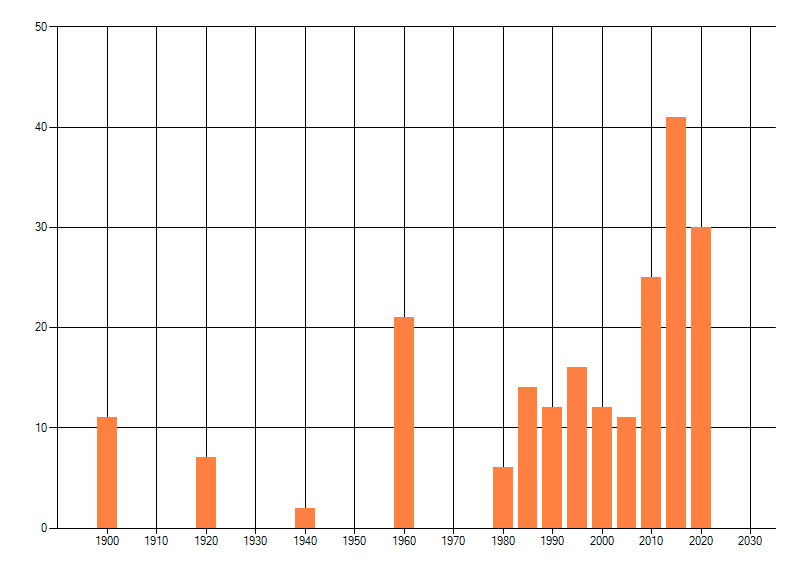 Het aantal atlasblokken (5x5 km) waarin de soort is gemeld binnen een periode van vijf jaar (vanaf 1980) of twintig jaar. Niet gecorrigeerd voor waarnemersinspanning en het aantal doorgegeven waarnemingen kan sterk variëren per periode, dus een trend in verspreiding kan hier niet direct uit worden afgelezen. Het opgegeven jaartal is het eerste jaar van de periode. Bron: gevalideerde waarnemingen uit de NDFF.