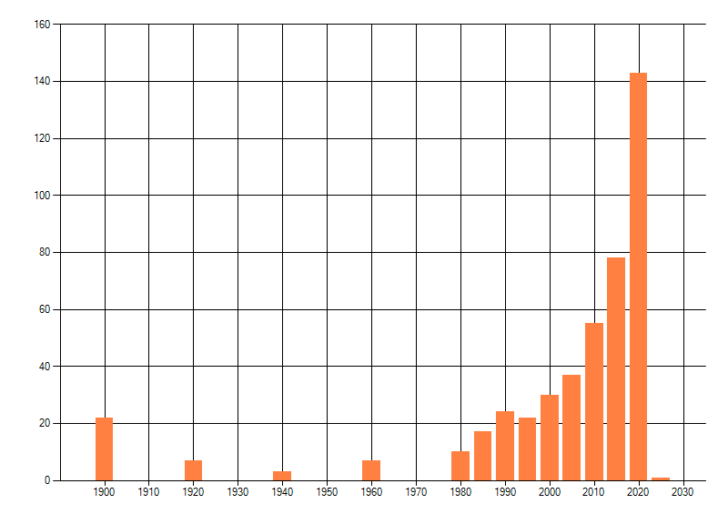Het aantal atlasblokken (5x5 km) waarin de soort is gemeld binnen een periode van vijf jaar (vanaf 1980) of twintig jaar. Niet gecorrigeerd voor waarnemersinspanning en het aantal doorgegeven waarnemingen kan sterk variëren per periode, dus een trend in verspreiding kan hier niet direct uit worden afgelezen. Het opgegeven jaartal is het eerste jaar van de periode. Bron: gevalideerde waarnemingen uit de NDFF.
