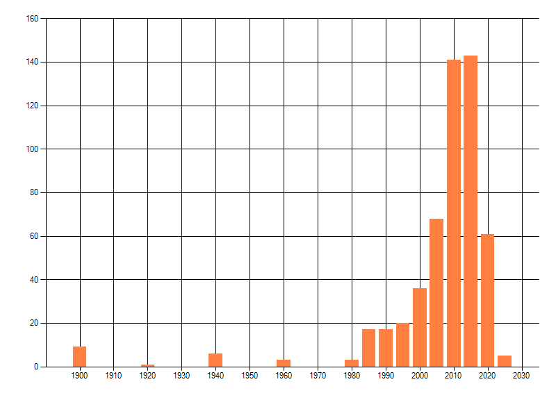 Het aantal atlasblokken (5x5 km) waarin de soort is gemeld binnen een periode van vijf jaar (vanaf 1980) of twintig jaar. Niet gecorrigeerd voor waarnemersinspanning en het aantal doorgegeven waarnemingen kan sterk variëren per periode, dus een trend in verspreiding kan hier niet direct uit worden afgelezen. Het opgegeven jaartal is het eerste jaar van de periode. Bron: gevalideerde waarnemingen uit de NDFF.