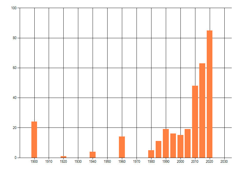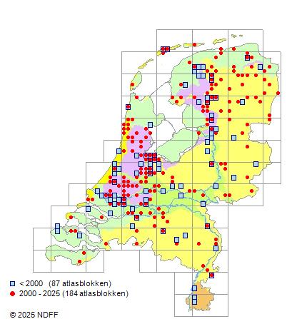 Het aantal atlasblokken (5x5 km) waarin de soort is gemeld binnen een periode van vijf jaar (vanaf 1980) of twintig jaar. Niet gecorrigeerd voor waarnemersinspanning en het aantal doorgegeven waarnemingen kan sterk variëren per periode, dus een trend in verspreiding kan hier niet direct uit worden afgelezen. Het opgegeven jaartal is het eerste jaar van de periode. Bron: gevalideerde waarnemingen uit de NDFF.