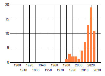Het aantal atlasblokken (5x5 km) waarin de soort is gemeld binnen een periode van vijf jaar (vanaf 1980) of twintig jaar. Niet gecorrigeerd voor waarnemersinspanning en het aantal doorgegeven waarnemingen kan sterk variëren per periode, dus een trend in verspreiding kan hier niet direct uit worden afgelezen. Het opgegeven jaartal is het eerste jaar van de periode. Bron: gevalideerde waarnemingen uit de NDFF.