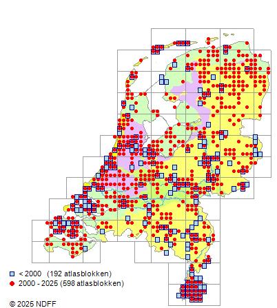 Het aantal atlasblokken (5x5 km) waarin de soort is gemeld binnen een periode van vijf jaar (vanaf 1980) of twintig jaar. Niet gecorrigeerd voor waarnemersinspanning en het aantal doorgegeven waarnemingen kan sterk variëren per periode, dus een trend in verspreiding kan hier niet direct uit worden afgelezen. Het opgegeven jaartal is het eerste jaar van de periode. Bron: gevalideerde waarnemingen uit de NDFF.