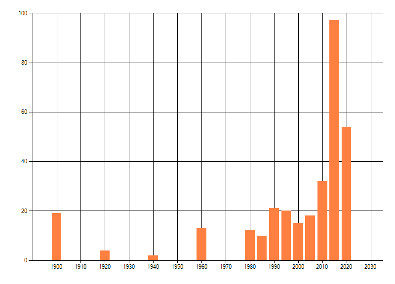 Het aantal atlasblokken (5x5 km) waarin de soort is gemeld binnen een periode van vijf jaar (vanaf 1980) of twintig jaar. Niet gecorrigeerd voor waarnemersinspanning en het aantal doorgegeven waarnemingen kan sterk variëren per periode, dus een trend in verspreiding kan hier niet direct uit worden afgelezen. Het opgegeven jaartal is het eerste jaar van de periode. Bron: gevalideerde waarnemingen uit de NDFF.