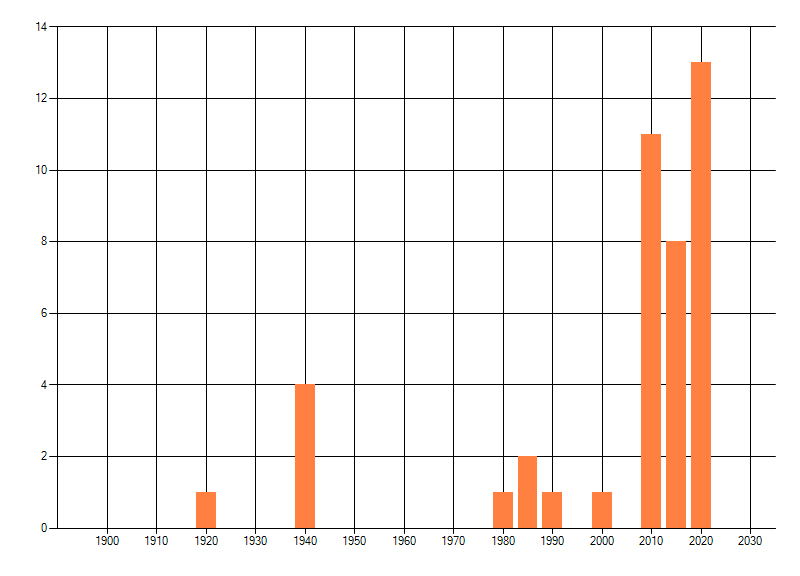 Het aantal atlasblokken (5x5 km) waarin de soort is gemeld binnen een periode van vijf jaar (vanaf 1980) of twintig jaar. Niet gecorrigeerd voor waarnemersinspanning en het aantal doorgegeven waarnemingen kan sterk variëren per periode, dus een trend in verspreiding kan hier niet direct uit worden afgelezen. Het opgegeven jaartal is het eerste jaar van de periode. Bron: gevalideerde waarnemingen uit de NDFF.