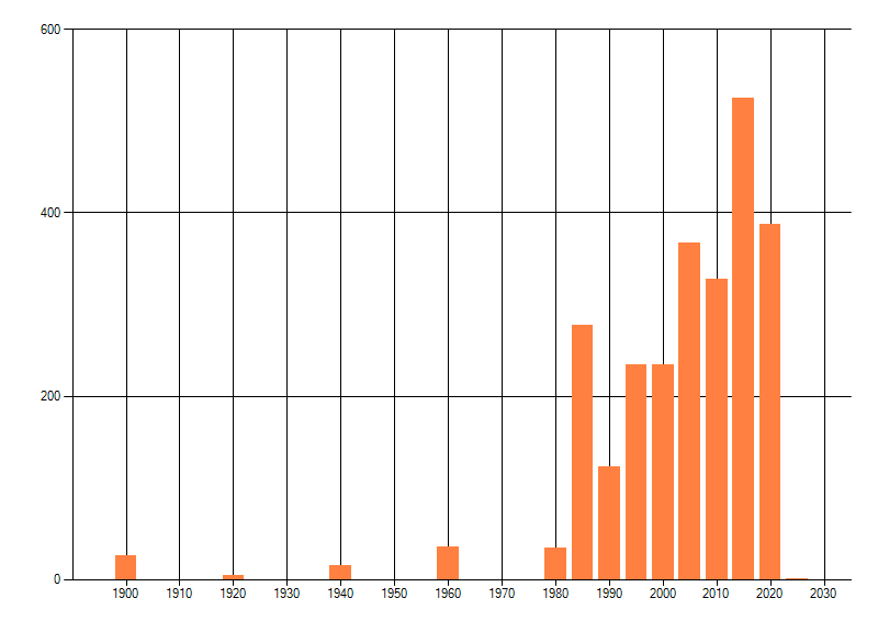 Het aantal atlasblokken (5x5 km) waarin de soort is gemeld binnen een periode van vijf jaar (vanaf 1980) of twintig jaar. Niet gecorrigeerd voor waarnemersinspanning en het aantal doorgegeven waarnemingen kan sterk variëren per periode, dus een trend in verspreiding kan hier niet direct uit worden afgelezen. Het opgegeven jaartal is het eerste jaar van de periode. Bron: gevalideerde waarnemingen uit de NDFF.