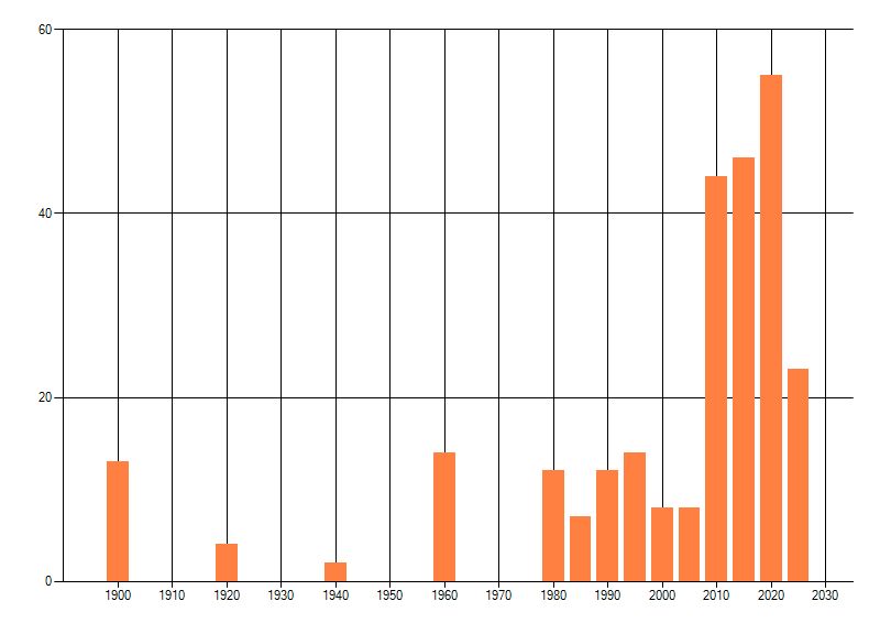 Het aantal atlasblokken (5x5 km) waarin de soort is gemeld binnen een periode van vijf jaar (vanaf 1980) of twintig jaar. Niet gecorrigeerd voor waarnemersinspanning en het aantal doorgegeven waarnemingen kan sterk variëren per periode, dus een trend in verspreiding kan hier niet direct uit worden afgelezen. Het opgegeven jaartal is het eerste jaar van de periode. Bron: gevalideerde waarnemingen uit de NDFF.