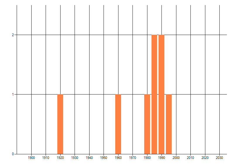 Het aantal atlasblokken (5x5 km) waarin de soort is gemeld binnen een periode van vijf jaar (vanaf 1980) of twintig jaar. Niet gecorrigeerd voor waarnemersinspanning en het aantal doorgegeven waarnemingen kan sterk variëren per periode, dus een trend in verspreiding kan hier niet direct uit worden afgelezen. Het opgegeven jaartal is het eerste jaar van de periode. Bron: gevalideerde waarnemingen uit de NDFF.