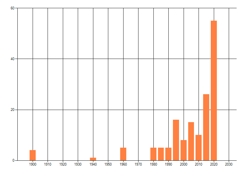 Het aantal atlasblokken (5x5 km) waarin de soort is gemeld binnen een periode van vijf jaar (vanaf 1980) of twintig jaar. Niet gecorrigeerd voor waarnemersinspanning en het aantal doorgegeven waarnemingen kan sterk variëren per periode, dus een trend in verspreiding kan hier niet direct uit worden afgelezen. Het opgegeven jaartal is het eerste jaar van de periode. Bron: gevalideerde waarnemingen uit de NDFF.