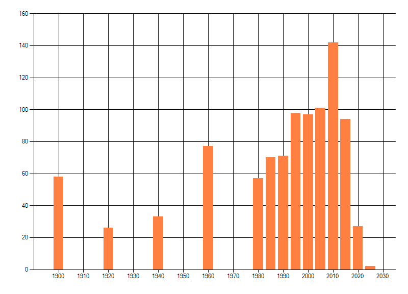 Het aantal atlasblokken (5x5 km) waarin de soort is gemeld binnen een periode van vijf jaar (vanaf 1980) of twintig jaar. Niet gecorrigeerd voor waarnemersinspanning en het aantal doorgegeven waarnemingen kan sterk variëren per periode, dus een trend in verspreiding kan hier niet direct uit worden afgelezen. Het opgegeven jaartal is het eerste jaar van de periode. Bron: gevalideerde waarnemingen uit de NDFF.