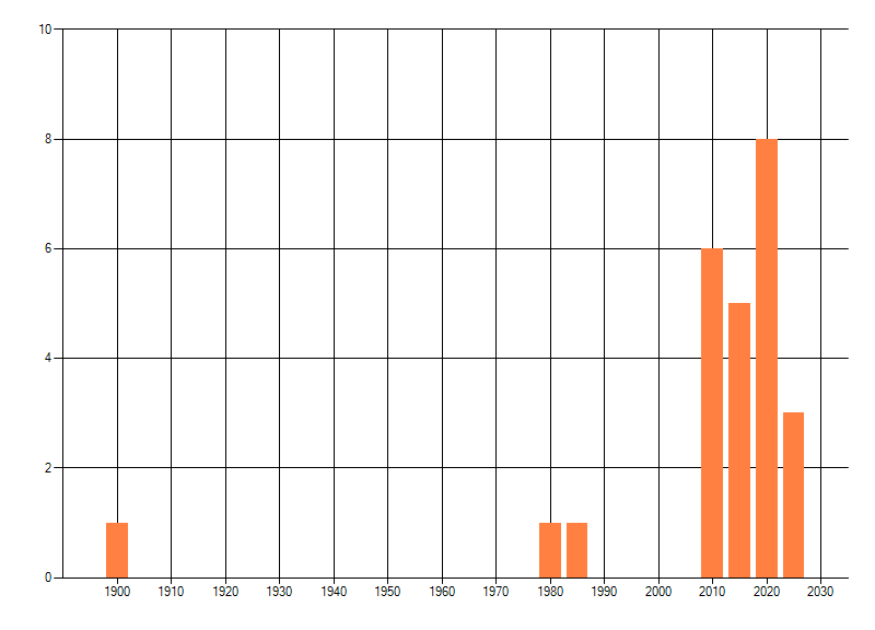 Het aantal atlasblokken (5x5 km) waarin de soort is gemeld binnen een periode van vijf jaar (vanaf 1980) of twintig jaar. Niet gecorrigeerd voor waarnemersinspanning en het aantal doorgegeven waarnemingen kan sterk variëren per periode, dus een trend in verspreiding kan hier niet direct uit worden afgelezen. Het opgegeven jaartal is het eerste jaar van de periode. Bron: gevalideerde waarnemingen uit de NDFF.