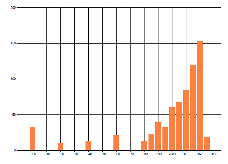Het aantal atlasblokken (5x5 km) waarin de soort is gemeld binnen een periode van vijf jaar (vanaf 1980) of twintig jaar. Niet gecorrigeerd voor waarnemersinspanning en het aantal doorgegeven waarnemingen kan sterk variëren per periode, dus een trend in verspreiding kan hier niet direct uit worden afgelezen. Het opgegeven jaartal is het eerste jaar van de periode. Bron: gevalideerde waarnemingen uit de NDFF.