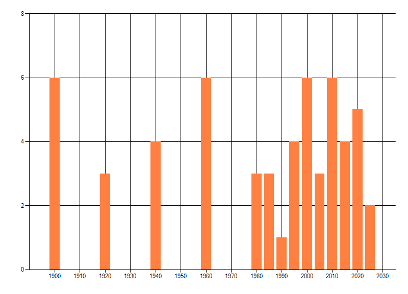 Het aantal atlasblokken (5x5 km) waarin de soort is gemeld binnen een periode van vijf jaar (vanaf 1980) of twintig jaar. Niet gecorrigeerd voor waarnemersinspanning en het aantal doorgegeven waarnemingen kan sterk variëren per periode, dus een trend in verspreiding kan hier niet direct uit worden afgelezen. Het opgegeven jaartal is het eerste jaar van de periode. Bron: gevalideerde waarnemingen uit de NDFF.