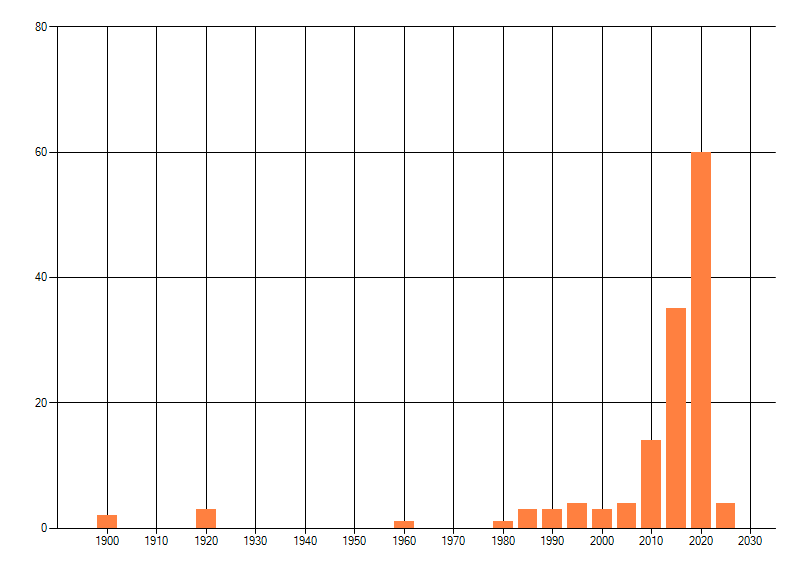 Het aantal atlasblokken (5x5 km) waarin de soort is gemeld binnen een periode van vijf jaar (vanaf 1980) of twintig jaar. Niet gecorrigeerd voor waarnemersinspanning en het aantal doorgegeven waarnemingen kan sterk variëren per periode, dus een trend in verspreiding kan hier niet direct uit worden afgelezen. Het opgegeven jaartal is het eerste jaar van de periode. Bron: gevalideerde waarnemingen uit de NDFF.