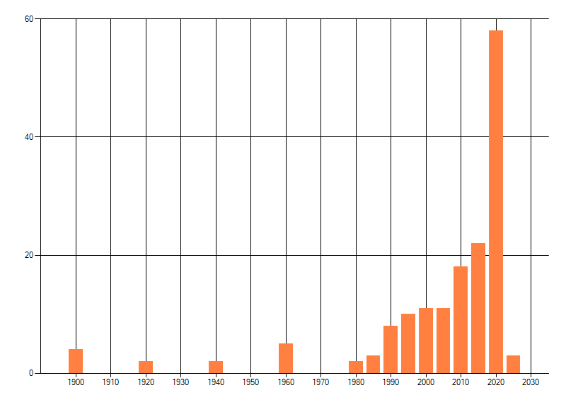 Het aantal atlasblokken (5x5 km) waarin de soort is gemeld binnen een periode van vijf jaar (vanaf 1980) of twintig jaar. Niet gecorrigeerd voor waarnemersinspanning en het aantal doorgegeven waarnemingen kan sterk variëren per periode, dus een trend in verspreiding kan hier niet direct uit worden afgelezen. Het opgegeven jaartal is het eerste jaar van de periode. Bron: gevalideerde waarnemingen uit de NDFF.