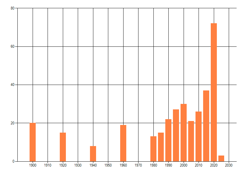 Het aantal atlasblokken (5x5 km) waarin de soort is gemeld binnen een periode van vijf jaar (vanaf 1980) of twintig jaar. Niet gecorrigeerd voor waarnemersinspanning en het aantal doorgegeven waarnemingen kan sterk variëren per periode, dus een trend in verspreiding kan hier niet direct uit worden afgelezen. Het opgegeven jaartal is het eerste jaar van de periode. Bron: gevalideerde waarnemingen uit de NDFF.