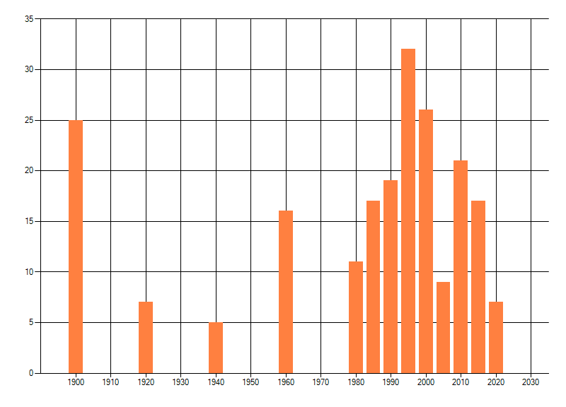 Het aantal atlasblokken (5x5 km) waarin de soort is gemeld binnen een periode van vijf jaar (vanaf 1980) of twintig jaar. Niet gecorrigeerd voor waarnemersinspanning en het aantal doorgegeven waarnemingen kan sterk variëren per periode, dus een trend in verspreiding kan hier niet direct uit worden afgelezen. Het opgegeven jaartal is het eerste jaar van de periode. Bron: gevalideerde waarnemingen uit de NDFF.