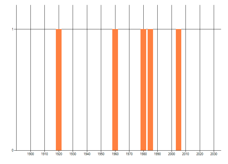 Het aantal atlasblokken (5x5 km) waarin de soort is gemeld binnen een periode van vijf jaar (vanaf 1980) of twintig jaar. Niet gecorrigeerd voor waarnemersinspanning en het aantal doorgegeven waarnemingen kan sterk variëren per periode, dus een trend in verspreiding kan hier niet direct uit worden afgelezen. Het opgegeven jaartal is het eerste jaar van de periode. Bron: gevalideerde waarnemingen uit de NDFF.