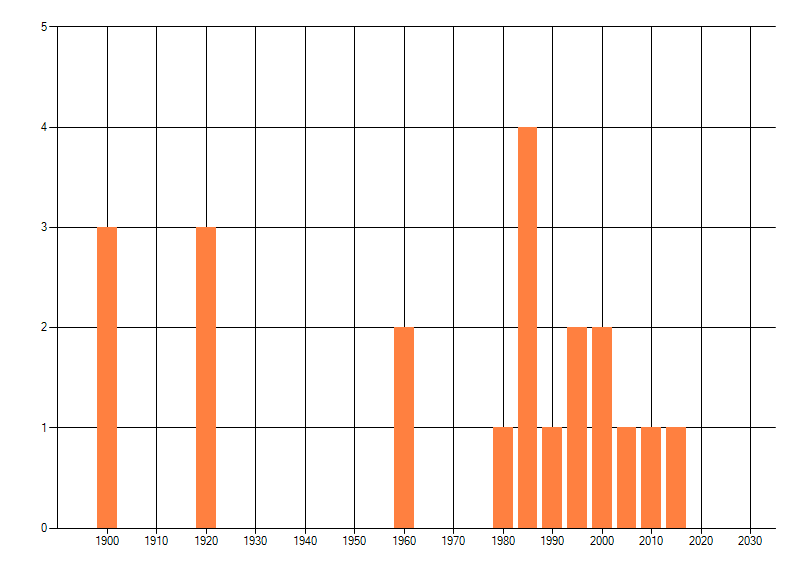 Het aantal atlasblokken (5x5 km) waarin de soort is gemeld binnen een periode van vijf jaar (vanaf 1980) of twintig jaar. Niet gecorrigeerd voor waarnemersinspanning en het aantal doorgegeven waarnemingen kan sterk variëren per periode, dus een trend in verspreiding kan hier niet direct uit worden afgelezen. Het opgegeven jaartal is het eerste jaar van de periode. Bron: gevalideerde waarnemingen uit de NDFF.