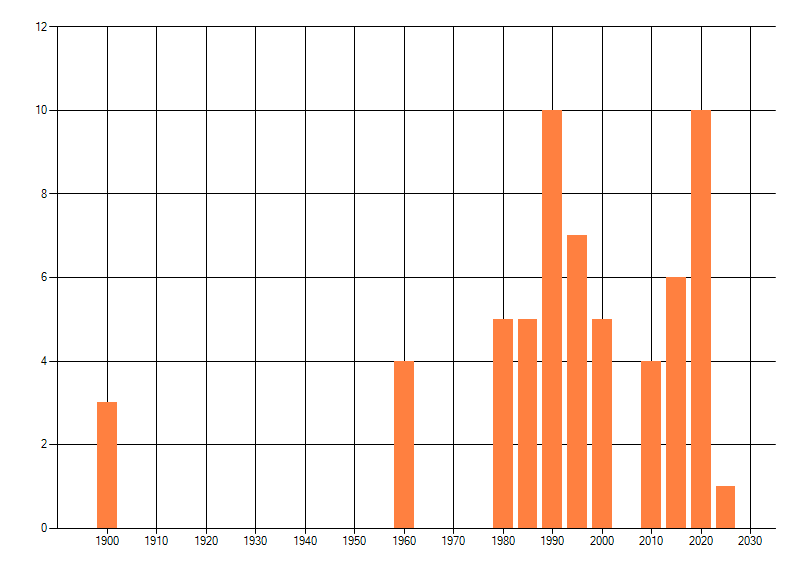 Het aantal atlasblokken (5x5 km) waarin de soort is gemeld binnen een periode van vijf jaar (vanaf 1980) of twintig jaar. Niet gecorrigeerd voor waarnemersinspanning en het aantal doorgegeven waarnemingen kan sterk variëren per periode, dus een trend in verspreiding kan hier niet direct uit worden afgelezen. Het opgegeven jaartal is het eerste jaar van de periode. Bron: gevalideerde waarnemingen uit de NDFF.