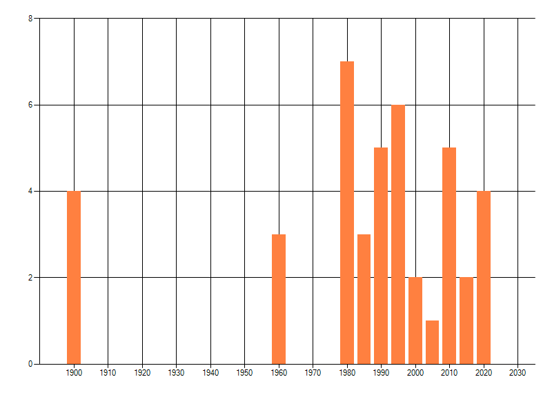 Het aantal atlasblokken (5x5 km) waarin de soort is gemeld binnen een periode van vijf jaar (vanaf 1980) of twintig jaar. Niet gecorrigeerd voor waarnemersinspanning en het aantal doorgegeven waarnemingen kan sterk variëren per periode, dus een trend in verspreiding kan hier niet direct uit worden afgelezen. Het opgegeven jaartal is het eerste jaar van de periode. Bron: gevalideerde waarnemingen uit de NDFF.